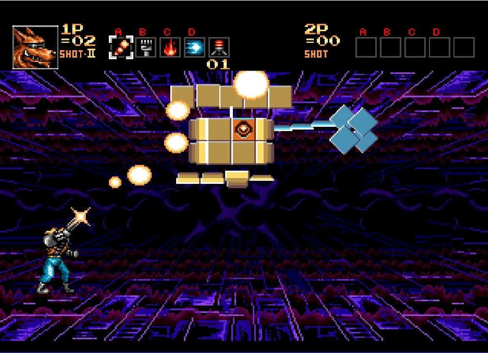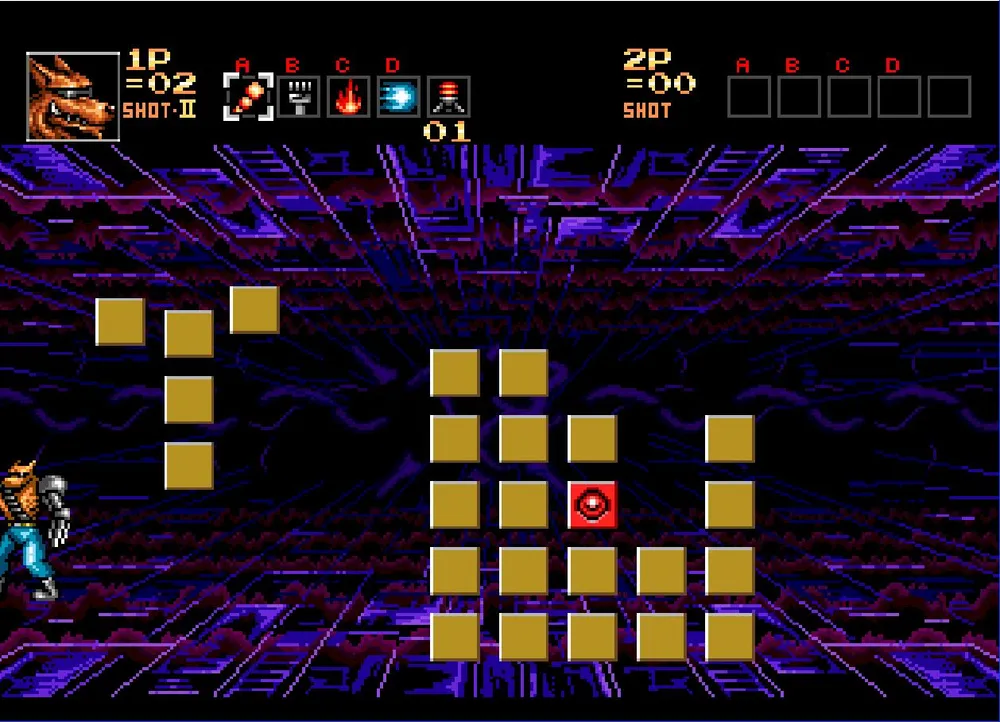 После того как победить вас «звездным» путем не выйдет хакер сменит тактику. Теперь вас будет атаковать подвижное скопление серых кубиков один кубик будет с синим глазом — это единственное уязвимое мнение в этом скоплении. Сначала все эти кубики сформируют стену в левом конце экрана. Некоторые из них примут форму буквы «Т» и отделившись от общей массы, прыгая по полу, постараются вас раздавить. От этой фигурки уклониться не сложно, проблема состоит в том, что при этом остальная масса кубиков будет надвигаться на вас стеной, уменьшая место для маневра, вот это и создает сложности. Вот тут как раз пригодиться первый режим стрельбы, позволяющий стрелять в движении.