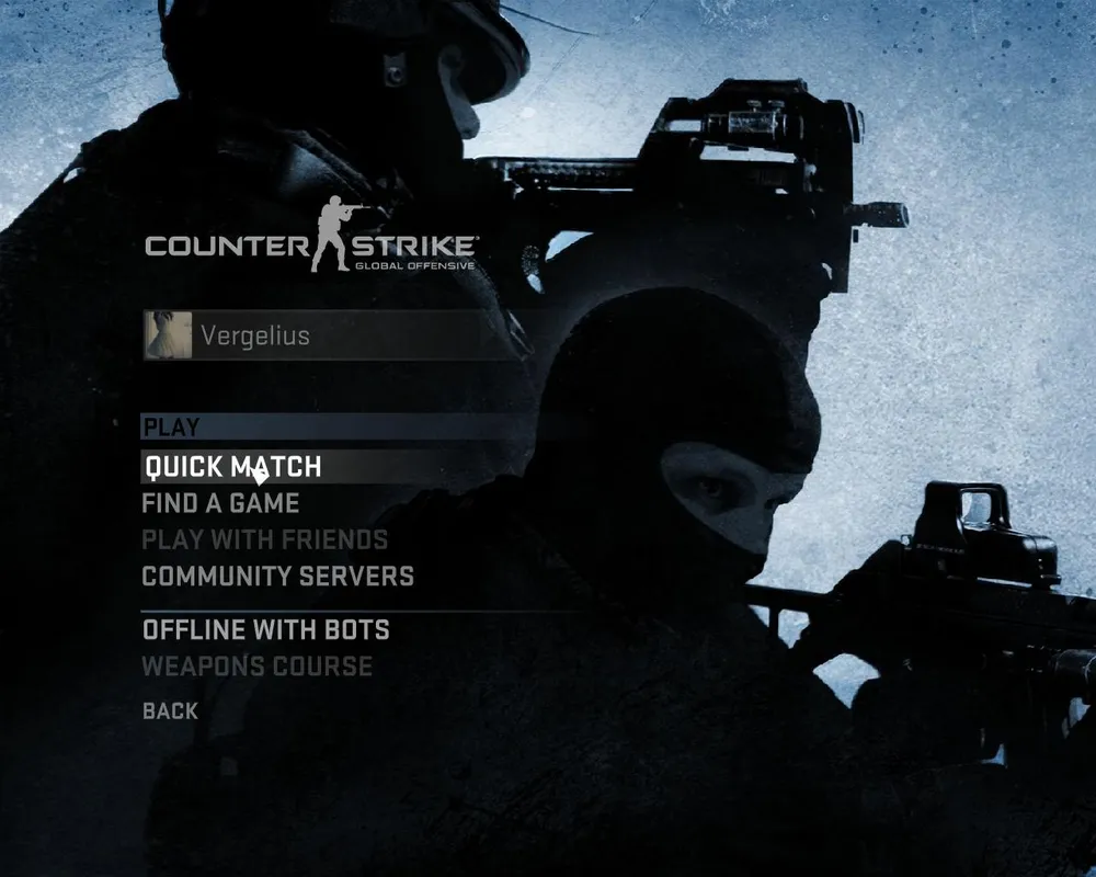 Как только мы запустим игру, нас уже окатает с головы до ног пафосная музыка, сопровождающаяся игровыми логотипами на экране – неудивительно, т.к. это является уже отличительным признаком всех игр, что это вышло в наше время. После всего этого, нас встречает совершенно новое меню, не похожее на таковое из 1.6 и Source. После нажатия кнопки “Play”, нам предлагается выбрать, каким образом мы будем искать сервера: Quick Math, где нас рандомно кидает на любое карту или режим, Find Game, где нам предлагают выбрать только режим игры (привет, Call Of Duty!), привычный нам Comunuty Servers, выдающий server list, ну или простая тренировка с ботами. Нажав на Find Game, нам предлагают на выбор 3 режима игры. Первый – Arms Race, в свое время неофициальный режим ,созданный лично игроками имеющий второе название Gun Game, представляет собой обычный Team Deathmath с единственным отличием, что за каждое убийство нам дается все лучше и лучше оружие. Второй – Demolition, где от нас просто требуется истребление врагов каждый раунд. Ну и последний режим, который мы все и так знаем, - Search & Destroied, разбитый на два типа: Classic Casual и Classic Competive. В принципе о режимах все.