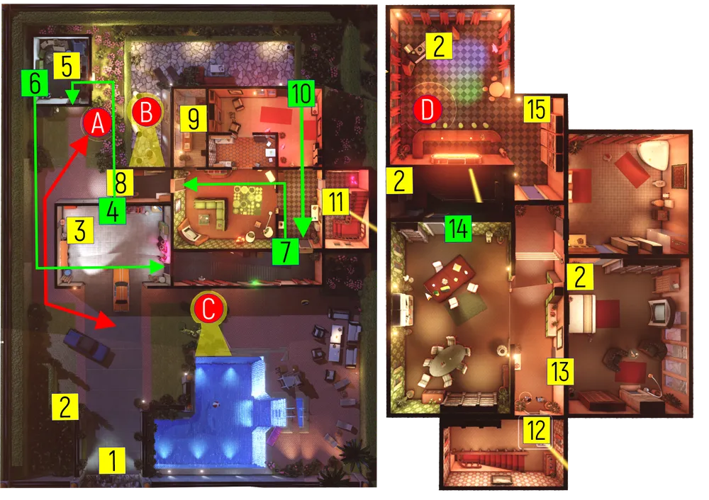 1 – начало миссии. 2 – добыча (100 $). 3 – ключ. 4 – сигнализация (летний домик). 5 – хлороформ. 6 – сигнализация (гаражная дверь). 7 – сигнализация (дверь холла). 8 – защищенная дверь. 9 – адреналин. 10 – сигнализация (коридорная дверь). 11 – переход на второй этаж. 12 – переход на первый этаж. 13 – запертая дверь. 14 – сигнализация (дверь хранилища). 15 – сейф. А, В, С, D – охранники.