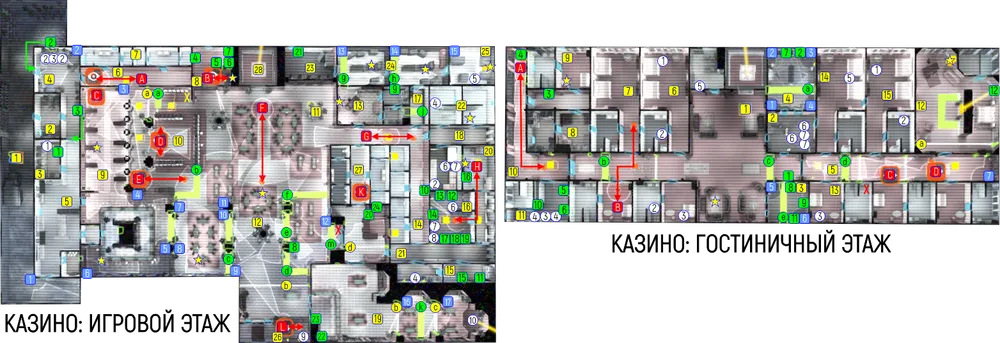 Игорный этаж: 1 – задний двор (начало миссии). 2 – северная кладовая. 3 – южная кладовая. 4 – склад. 5 – холодный склад. 6 – северный коридор. 7 – туалеты. 8 – северный пост охраны. 9 – кафетерий. 10 – зона игровых автоматов. 11 – растение в кадке. 12 – зона игровых столов. 13 – бухгалтерия. 14 – центральный коридор. 15 – восточная кладовая. 16 – аппаратное помещение. 17 – проходная комната. 18 – восточный коридор. 19 – VIP-зона. 20 – подсобное помещение. 21 – южный коридор. 22 – душевые помещения. 23 – обменный пункт. 24 – хранилища денег. 25 – главное хранилище. 26 – южный пост охраны. 27 – центральный пост охраны. 28 – лифт (место перехода на гостиничный этаж).