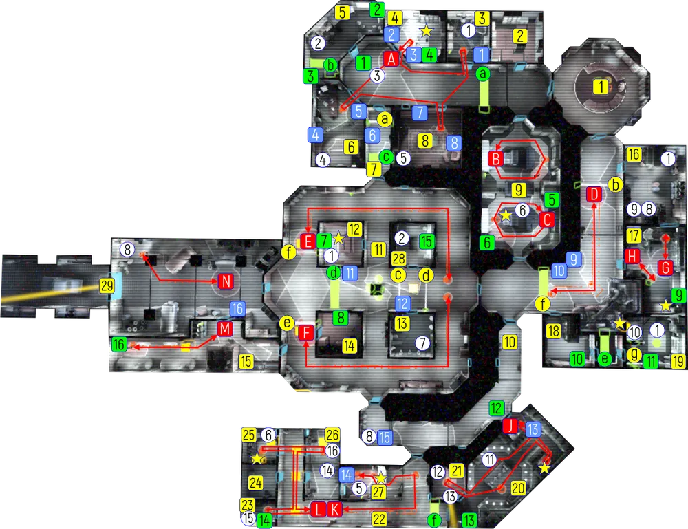 А-N – охранники; линиями со стрелками показаны их маршруты. Зелеными квадратами показаны выключатели Голубыми квадратами показаны камеры слежения. Белыми кругами показаны вещи. Зелеными кругами показаны шоковые панели. Звездами показаны контейнеры с добычей.