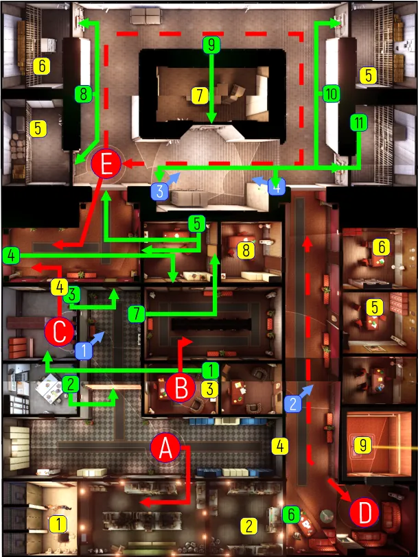 1 – туалет (начало миссии). 2 – хитрые подошвы. 3 – ключ от запертой двери. 4 – запертая дверь. 5 – добыча (100 $). 6 – сейф (300 $). 7 – схемы сигнализации. 8 – восточный офис. 9 – лифт (конец миссии). А, В, С, D – охранники; стрелками показаны места, куда они ненадолго направляются после того, как придут в сознание; пунктирными линиями показаны маршруты охранников. Зелеными квадратами показаны выключатели, стрелки от них ведут к отключаемым объектам. Голубыми квадратами показаны камеры слежения: стрелки от них указывают направление, в которое они направлены.