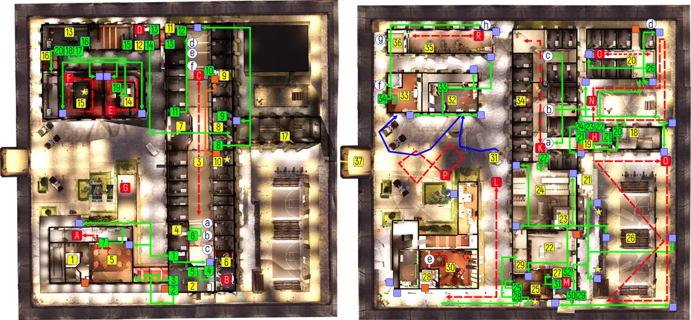 Первый этаж: 18 – лестничный пролет (место появления на первом этаже). 19 – караульное помещение. 20 – штрафной изолятор. 21 – хозяйственная полоса. 22 – кухня. 23 – участок раздачи пищи. 24 – столовая. 25 – прихожая. 26 – спортплощадка. 27 – помещение терминалов. 28 – офис. 29 – вход в столовую. 30 – кабинет. 31 – пикап. 32 – контрольная комната. 33 – бильярдная. 34 – камера. 35 – склад. 36 – хранилище. 37 – точка эвакуации.