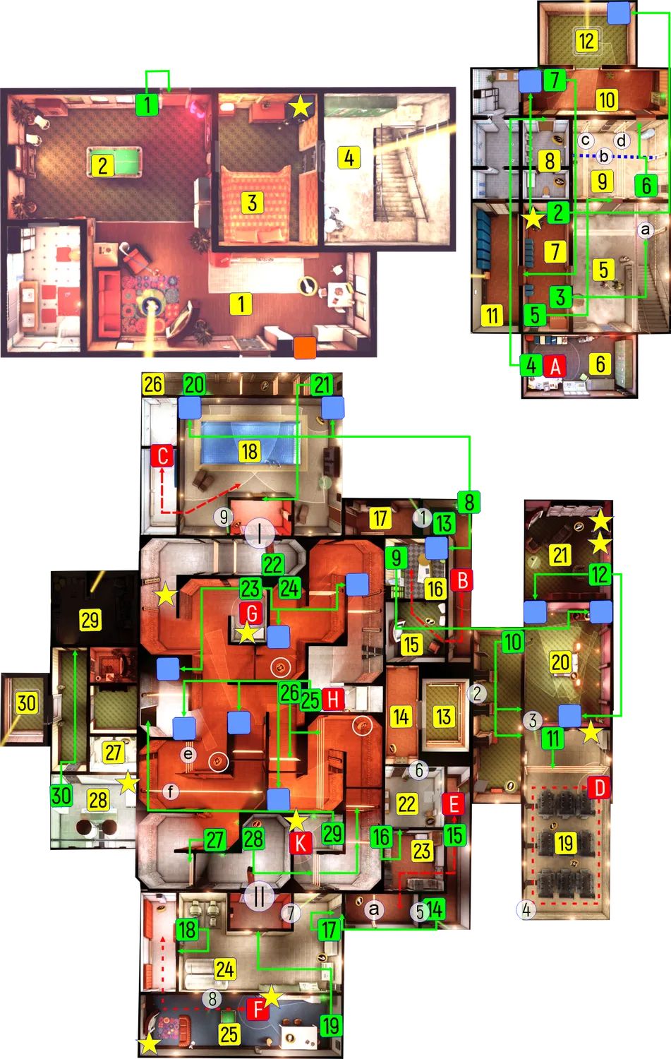 А, В, С, D, E, F, G, H, K – охранники; пунктирными линиями показаны их маршруты. Зелеными квадратами показаны выключатели, стрелки от них ведут к отключаемым объектам. Голубыми квадратами показаны камеры слежения.Оранжевыми квадратами показаны воздухозаборники и вентиляционные шахты. Звездами показаны контейнеры с добычей.