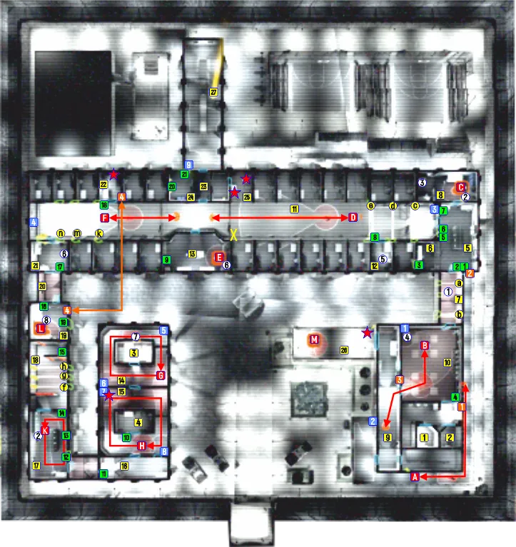 1 – туалет А (начало миссии у Рокет). 2 – туалет В (начало миссии у Лобковица). 3 – камера С (начало миссии у Бишопа). 4 – камера D (начало миссии у Клеопатры). 5 – аппаратное помещение. 6 – пост охраны А. 7 – восточный коридор. 8 – пост охраны В. 9 – коридор столовой. 10 – столовая. 11 – центральный коридор. 12 – камера Е. 13 – пост охраны С. 14 – коридор камеры С. 15 – коридор камеры D. 16 – южный коридор. 17 – операторское помещение. 18 – комната защиты. 19 – пост охраны D. 20 – западный коридор. 21 – КПП. 22 – камера F. 23 – узловой проход. 24 – камера G. 25 камера Н. 26 – терраса. 27 – место эвакуации.
