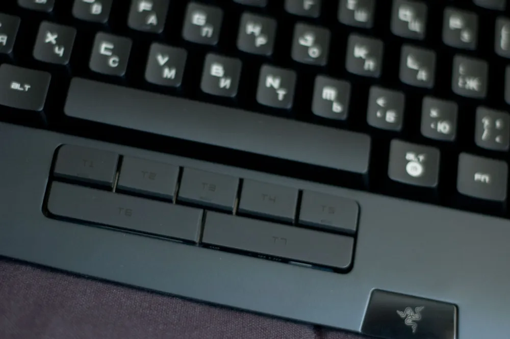 Теперь личное мнение. Вы удивитесь, но я не использовал эти 7 кнопок в качестве «модиферов». После нескольких серьезных попыток перевесить часть «биндов» на них я потерпел неудачу. Понял, что я не смогу в добавок к Ctrl, Alt, Shift использовать еще и панель под большой палец. К тому же верхний ряд (кнопки с T1 по T5) абсолютно не чувствуется при попытке найти их вслепую, а с длинными пальцами (как у пианиста) использовать их вообще оказалось не очень удобно. Поэтому для себя я решил, что буду использовать эти клавиши, как обычные «бинды» и теперь в World of Warcraft или RIFT удастся «забиндить» все, что нужно. Благо, используя программу драйверов от Razer Anansi это можно сделать без проблем.