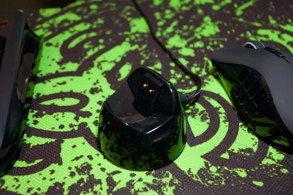 Теперь о самом важном нововведении Razer Naga EPIC, которое мне не пригодилось. Но многим, безусловно, спасет жизнь, нервы, уменьшит количество проводов и доставит радость. Мышка теперь может работать в беспроводном режиме. Для этого у нее есть аккумулятор, док-станция и возможность заряжаться, работая до 12 часов. Док подключается к USB, потом они с мышкой находят друг друга (одновременным нажатием кнопки pair) и все готово. Сама док-станция тяжеленькая, будет стоять там, где вы ее поставите. А мышка очень легко устанавливается на зарядку (заряжать мышку в доке необходимо установив переключатель в положение OFF - это рекомендация от Razer). Ну а если вы такой же любитель проводов, как я, то положите док-станцию в коробку и подключите мышку проводом. Ну разве это не прекрасно? Ведь провод делает мышку полным аналогом первой Razer Naga. Правильное инженерное решение!