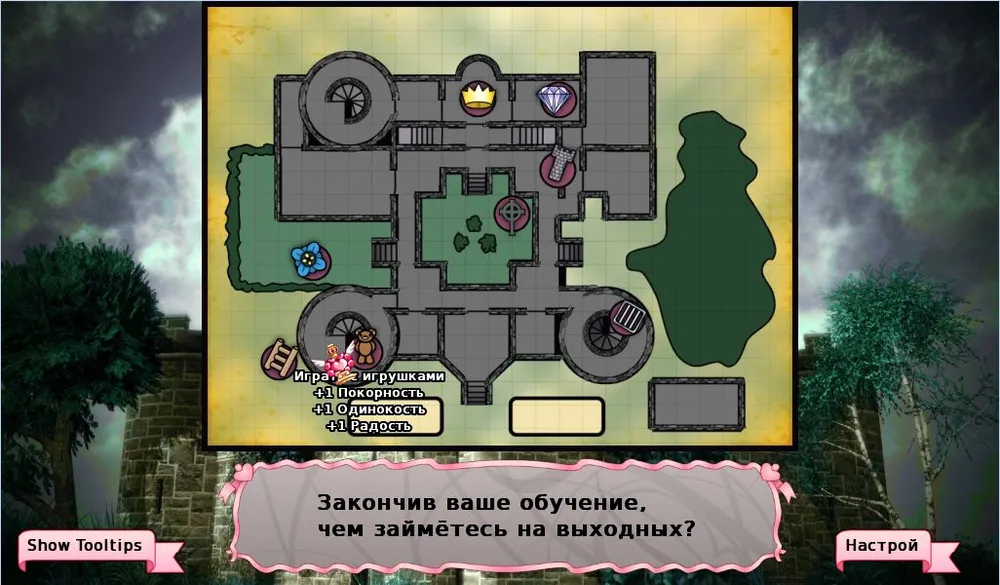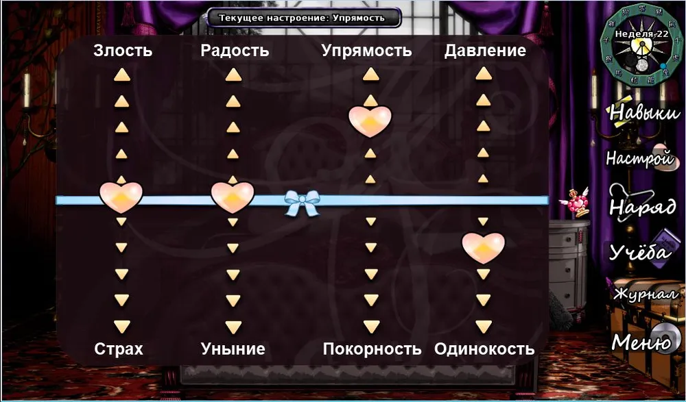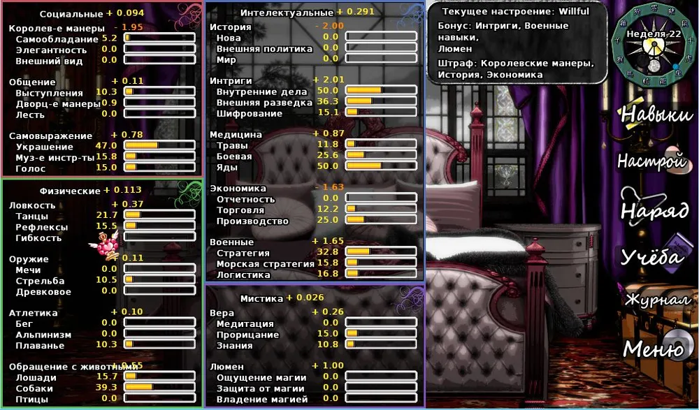 Например, подавленная героиня лучше обращается с животными, но про уроки фехтования и стрельбы из лука ей лучше забыть. При упрямом настроении хорошо изучать интриги, военные навыки, но бесполезно королевские манеры, историю и экономику.