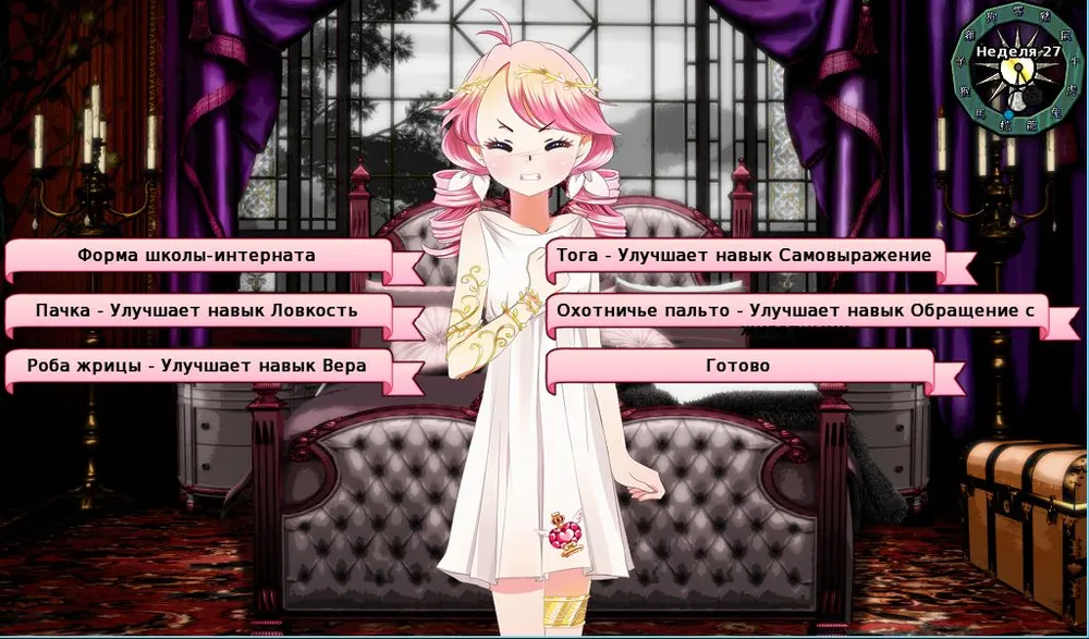 На уровень увеличения знаний за одну неделю влияют два основных фактора – суммарное количество очков в категории, (чем дольше мы занимаемся этой категорией, тем быстрее идет прокачка в ней), и настроение нашей принцессы. Ну а также имеются костюмы.