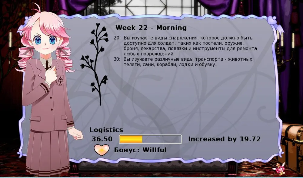 Прокачка навыков происходит следующим образом: каждую неделю нам дают выбрать по одному виду утренних и вечерних занятий, и эти два предмета изучаются все пять дней. Обычно каждая неделя занятий увеличивает знания Элоди по предмету на 10 пунктов из 100 возможных, причем для прокачки навыка выше 50 пунктов, нужно, чтобы знания по каждому предмету в этой подкатегории были не ниже 25.