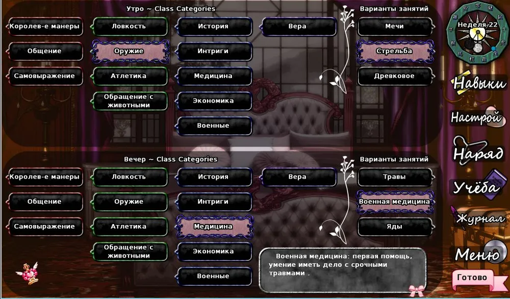 Очень желательно, просто необходимо изучать те навыки, к которым есть бонусы. По мере прокачки тех или иных навыков: Ловкости, военных навыков или обращения с животными, появится возможность в выходные дни посетить спортплощадку, казармы или прокатиться на лошади во время охоты.