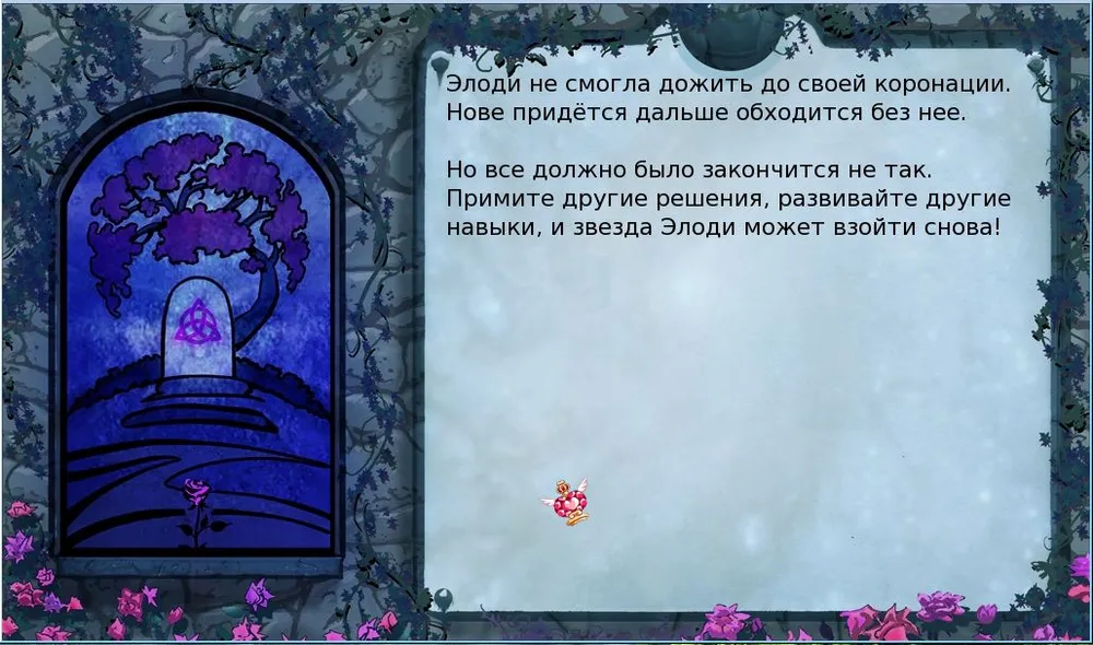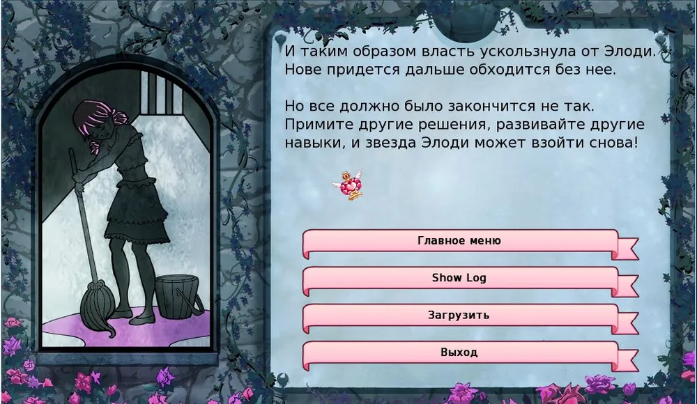Все же игра проработана великолепно, есть множество путей достижения успеха, и если бы не минимализм сюжетных сценок и эпилога и некоторые вопросы к прокачке навыков и их связи с настроением Элоди, можно бы назвать её маленьким шедевром. Хотелось бы видеть иногда короткие слайды, а не статичные задники, больше ясности с прокачкой навыков. Конечно после нескольких попыток и выучки последствий принятых решений, ты понимаешь что надо изучить из навыков, заучить сюжет, чтобы пройти дальше. Но я бросал несколько раз игру, так и не выдержав нудности выборов, перебора навыков, повторов одних и тех же сцен.