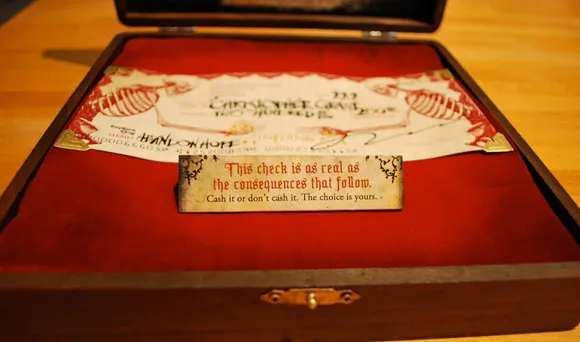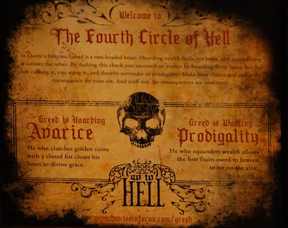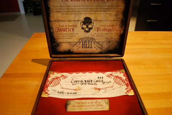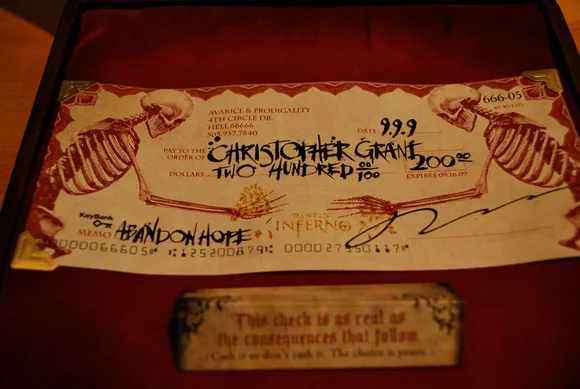 Electronic Arts продолжают изобретательно рекламировать Dante's Inferno. Теперь очередь дошла до пятого круга ада - в нем наказывают скупцов и расточителей. В офис joystiq и других изданий пришла вот такая деревянная коробочка. Внутри - чек на 00 с пояснением: "Если вы обналичите чек, то будете повинны в алчности, отвратительной жажде наживы, а если нет - то потратите его напрасно, поддавшись греху мотовства". Трудный выбор, правда?