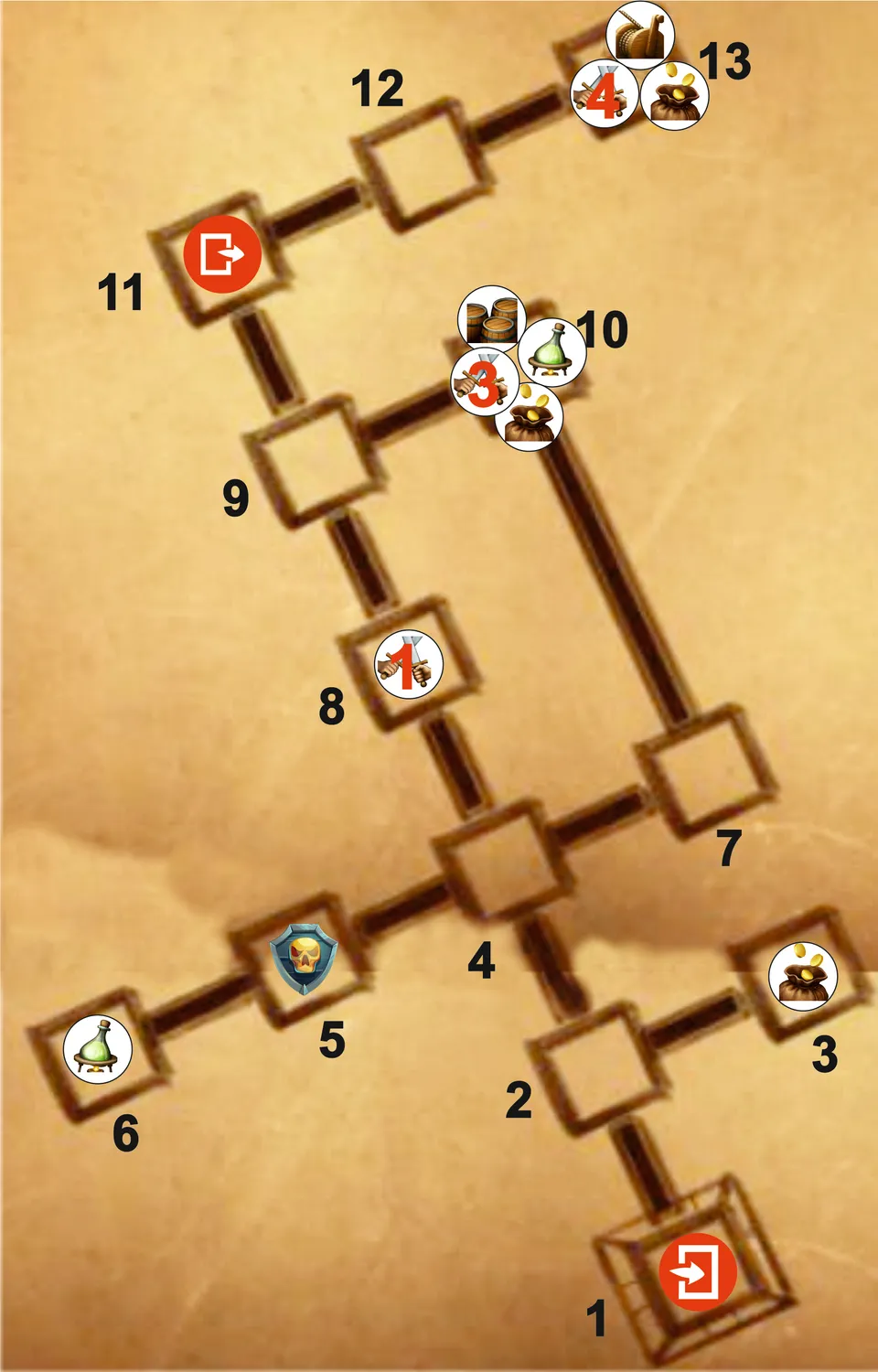 13. Зал с рычагом и золотом, охраняемый четырьмя гоблинами-воинами, один из которых воин-мастер. Перебив их, соберите золото, поверните рычаг и возвращайтесь к карлику.