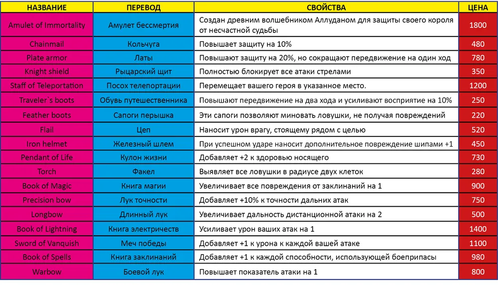 Для того чтобы в панели экипировки появлялись уникальные предметы, для начала их следует создать. Таблица предметов, предлагаемых для создания, приводится ниже.