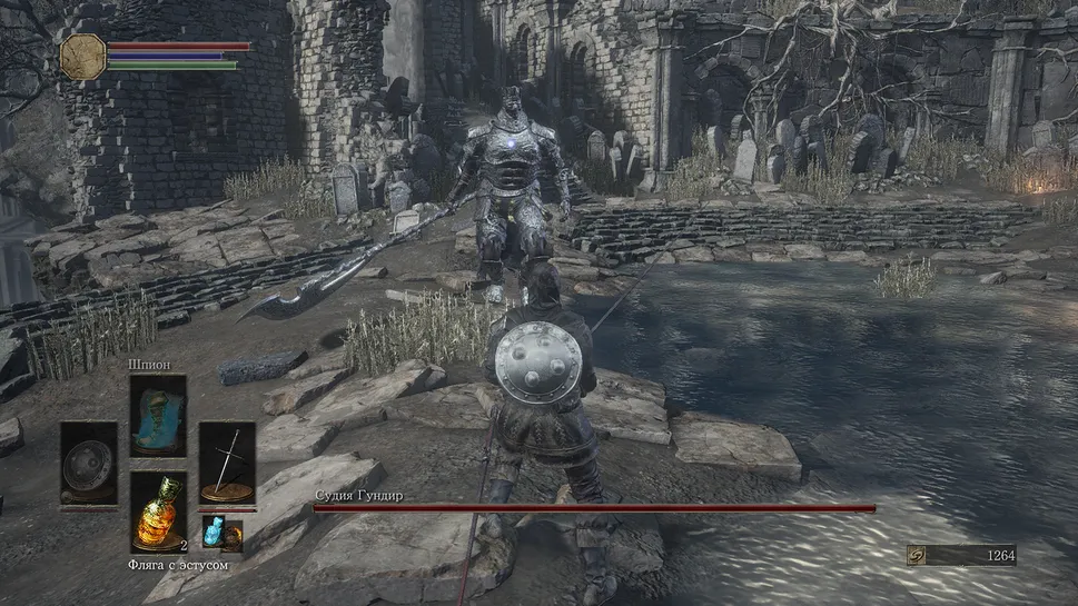 5. Хочу написать, как лучше начать игру в самой первой локации, чтобы не получить лишних проблем с первых шагов. Итак, мы выбрали Ассасина и черные бомбы, посмотрели ролик и оказались на кладбище пепла. Начинаем убивать первых противников, собираем первые вкусняшки, включая Пепельную флягу Эстуса, и читаем надписи – советы от разработчиков. Когда вы в определенный момент повернете направо и увидите надпись «Поворачивайте назад» - советую так и сделать! Впереди Гигантская ящерица. Убить ее сейчас можно, но с минимумом стойкости крайне сложно, поэтому лучше отложить это на потом. Поэтому бежим дальше, активируем костер возле босса, убиваем рядовых мобов, обязательно подбираем огненные бомбы и идем убивать Судью Гундира. В 1 фазе тактика его убийства очень проста: сначала бежим к боссу, вытаскиваем меч и, пока он встает, наносим несколько ударов и отскакиваем. Далее уворачиваемся от всех его ударов и ждем, когда он прыгнет на нас. Когда это происходит, делаем кувырок вбок и наносим 2 удара, затем отскакиваем. Повторяем, сколько необходимо, пока не убьем. Во 2 фазе из него появляется гнилостная полость, которая очень уязвима к огню. Начальный дар – черные бомбы, плюс огненные бомбы, которые вы найдете недалеко от арены – это решение вопроса. Главное – не мазать больше 3 раз, ибо босс может в момент кидания бомбы отпрыгнуть в сторону. После победы активируем костер и бежим в Храм Огня, попутно убивая всякую мелочь. В Храме тратим все накопленные души на повышение стойкости. После этого поднимаемся наверх, к башне, запрыгиваем на крышу и проникаем внутрь башни Храма Огня, где находится Птенец, с которым можно обмениваться полезными вещами, а в тайнике лежит Кольцо Серебряного Змея, которое увеличивает прирост душ на 10%. Именно оно нам и нужно. Рядом с крышей в закутке есть кристальная ящерица, которую можно убить, повторно запрыгнув на крышу. Одеваем кольцо. После убийства первого босса мы в угольной форме, т.е. жизнь прибавилась, стойкость мы подкачали – вот теперь пришло время убить Гигантскую ящерицу.