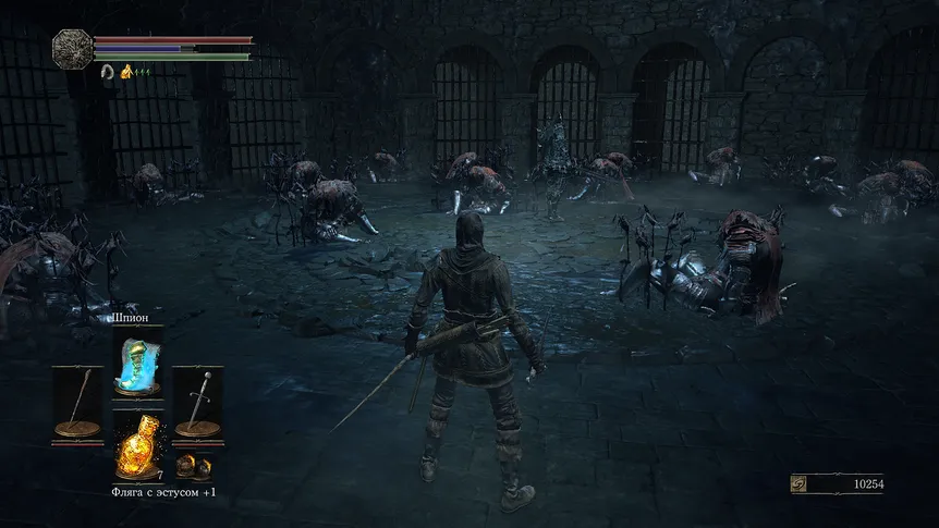 10. Меч тьмы. Как много о нем информации в Интернете! Он выпадает из Темного духа, который сидит за изначально запертой дверью в Высокой стене Лотрика, там же, где и Мимик. Чтобы открыть дверь, надо в Поселении Нежити найти бледный язык, и отдать его в Храме Огня Леонхарду Безымянный Палец, после чего мы получим ключ и сможем попытаться выбить из Темного духа меч тьмы. Но здесь есть сложности: 1) Темный дух – достаточно сильный противник на начальном этапе игры; 2) выпадение меча – это чистый рандом. Я убивал духа в этой локации раз 50, но меча так и не получил (выпадал части его сета и бледный язык). Зато когда я первый раз убил этого моба в локации Путь жертв – с него тут же выпал Меч Тьмы. Так что дерзайте…