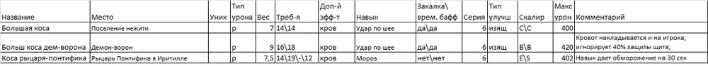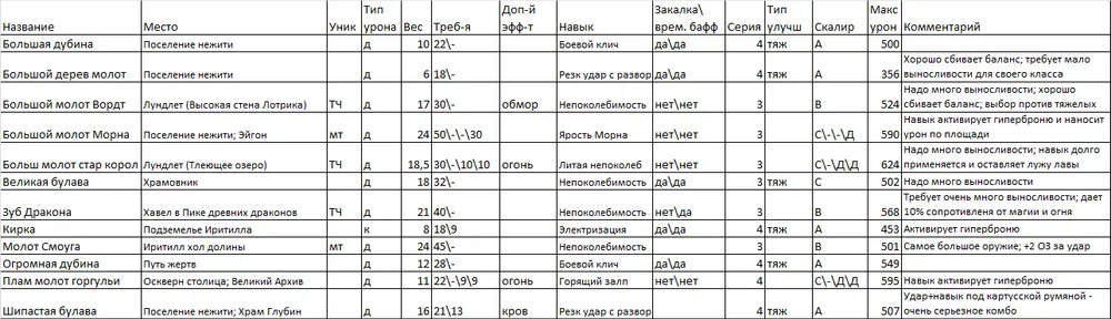 Я выделил парное оружие в отдельную таблицу, т.к. мне кажется, что это отдельный специфичный класс. Я им не играю, но клинки Хранителя и Топоры Крылатого рыцаря показались мне весьма интересными, ибо именно от их обладателей я хорошо получал очень много раз…