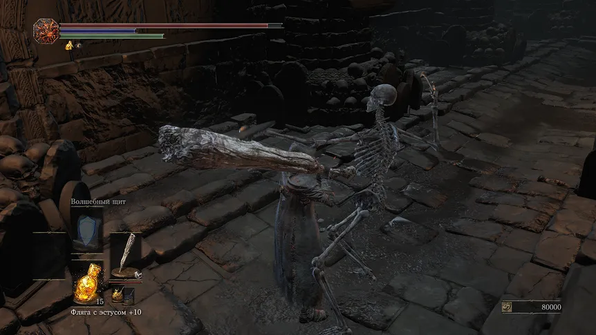 5. Мощное оружие с дробящим уроном: Огромная дубина\Шипастая булава. Кстати, именно этот тип оружия, в условиях дефицита кусков титанита, вполне достаточно прокачать максимум до +9 – этого хватит.