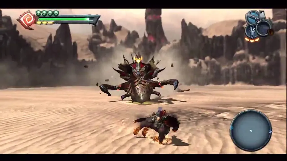 2."Горящие виселицы" На арене Самаэля подходим к обрыву за центральной горгульей, прыгаем вниз, немного пролетаем, совершаем второй прыжок и на крыльях плавно спускаемся на уступ лицом к арене. Берем фрагмент.