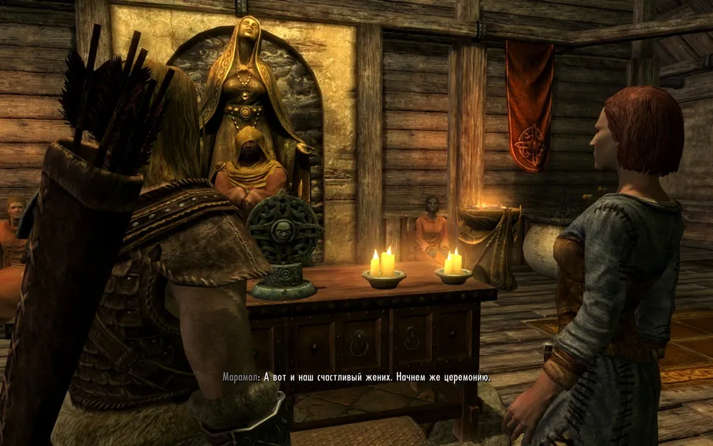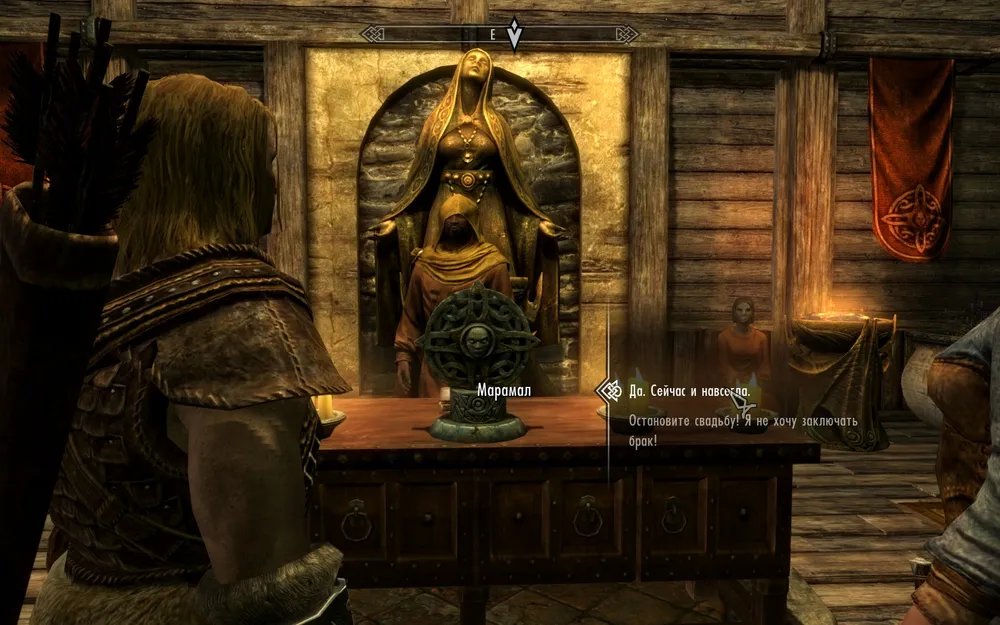 Пошла я, значитцо, в игре женитцо. Выбрала в мужья наемника Ворстага, с которым бегала зачищала Скайрим. Объявили о свадьбе. Пришли в храм. Нам говорят - ваша свадьба с рассвета до заката завтра. Но я, ученая гайдами, пришла к храму через 23 часа, зашла в храм еще через час. Там стоит жених. Мне говорят а вот невеста пришла. Маламар читает речь, спрашивает согласия. После того как я говорю ДА!.......... жених вдруг переодевается в свою одежку, и, не дожидаясь окончания речи, разворачивается и выходит из храма. Более того, все гости, в том числе сидевшая на скамеечке Лидия, резко выбегают из храма (!).