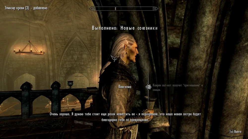 Это задание выдает Вингалмо. Он расскажет о том, что семье нужно пополнение, и попросит нас обратить человека, который подходит. Этот человек может находиться в любом населенном пункте. Мне нужно было обратить Каирию из Маркарта. Находим её, накладываем заклинание "Обольщение вампира" и питаемся, так мы заражаем её кровь и через некоторое время она превратится в вампира.