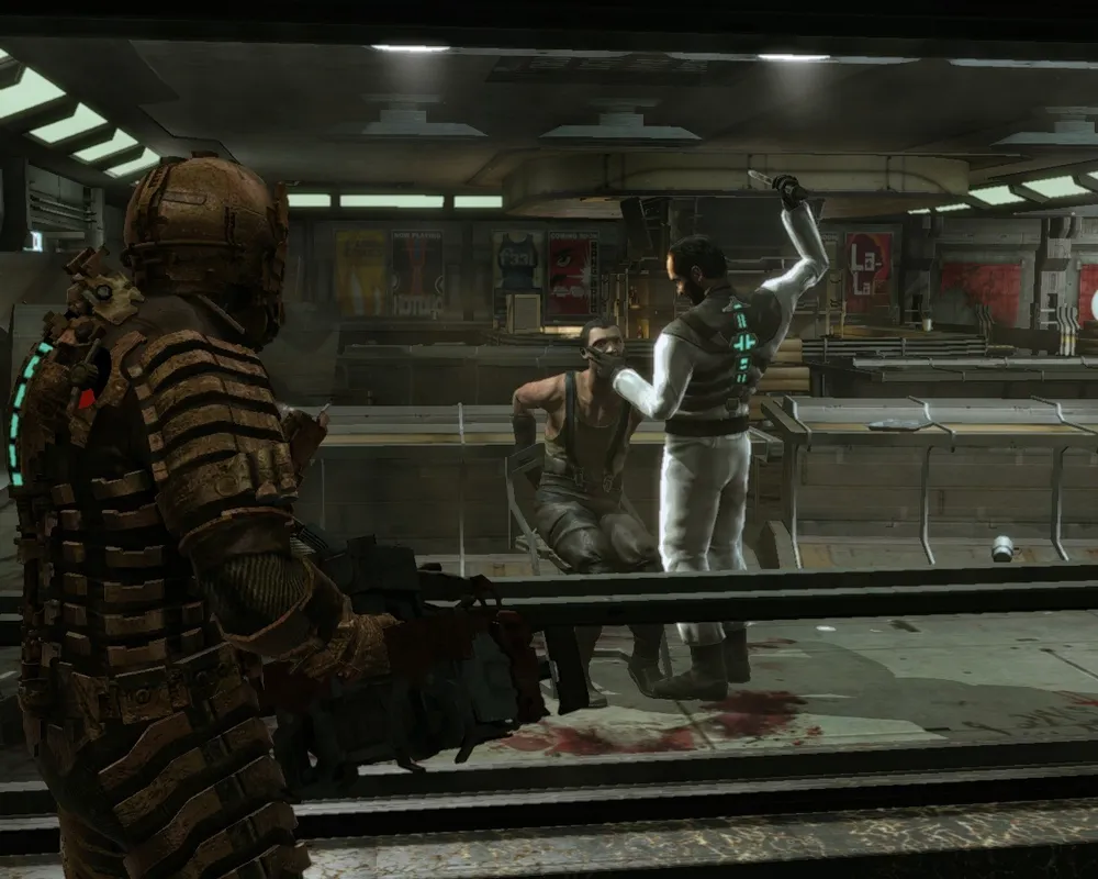 Действительно, не раз приходилось делать над собой усилие, чтобы идти дальше. Нет, не потому, что играть не хотелось. Просто от страха порой топчешься на одном месте, не решаясь двинуться вперед. Темнота, обшарпанные коридоры станции, заляпанные кровью до самого потолка комнаты и испещренные зловещими надписями стены производят гнетущее впечатление. Утробное рычание монстров, шелест лап, доносящийся из вентиляционных шахт, и скрежет разрываемого металла давят на нервы. А тут еще сценаристы подливают масла в огонь: периодически герою попадаются аудио-, видео- и текстовые материалы, которые проливают свет на то, что творилось на корабле до появления ремонтной бригады. И скриптовые сценки... Ролики на движке могут свести с ума кого угодно! Прислонившаяся к стене девушка истерически смеется при появлении героя, а затем пускает себе пулю в голову. Несчастный, истерзанный монстрами, разносит себе череп о железную трубу. Истошно орущий охранник держит перед собой свою же оторванную ногу. В такие моменты становится по-настоящему страшно – просто из-за того, что не понимаешь, что за чертовщина творится на корабле. И переминаешься с ноги на ногу, набираясь духу, чтобы открыть очередную дверь.