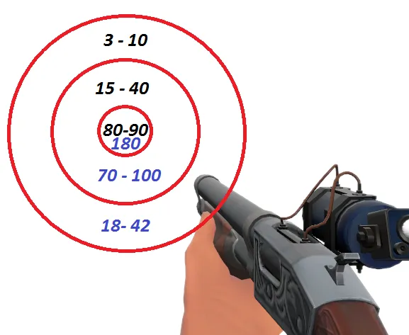 Маленькая схемка урона дробовика на разных дистанциях. В центре это ваш прицел, второй круг это средняя дистанция, а следующий уже для дальнего расстояния. Синимпоказан критический урон на этой дистанции.