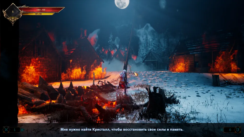 Нам необходимо провести главного героя, который похож на Кратоса, через три типа локаций (ледяная пустыня, шахты, мрачный лес), чтобы он вернул свой облик и восстановил силы. Облик восстанавливается с помощью осколков кристалла, которые укрываются в разных уголках нашего приключения, а силы прокачиваются благодаря простой ролевой системе: накапливаем опыт после убийства врагов, получаем уровень и вкладываем их в мощь/выносливость/живучесть. Мощи увеличивает силу атаки, выносливость позволяет чаще атаковать, а живучесть – дольше жить. Есть еще показатель защиты, который напрямую прокачивать нельзя, но можно повышать с помощью одноразовых улучшений, спрятанных на уровнях, и с помощью вооружения.
