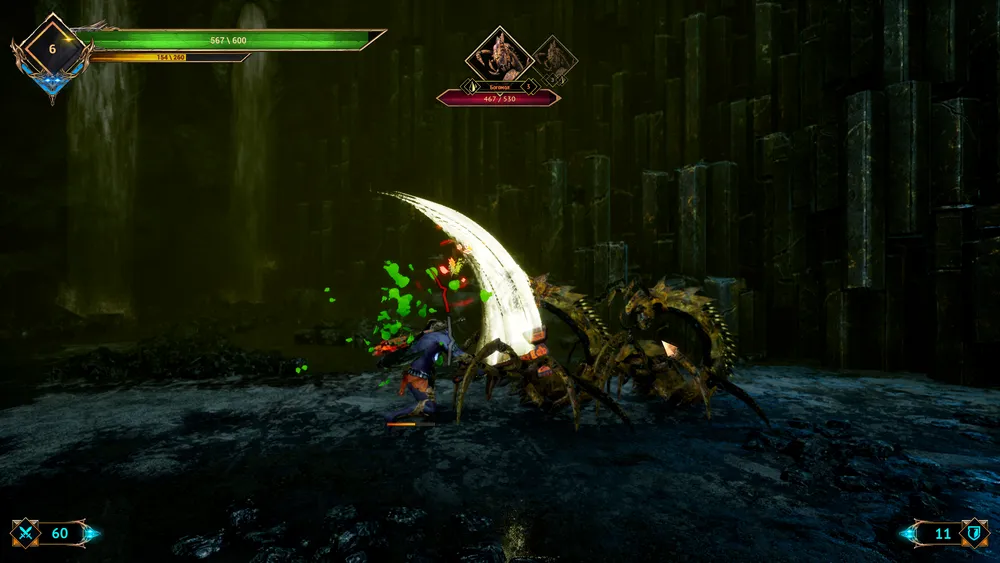 Вообще, к битвам есть два подхода. Первый подход - следовать правилам игры, быть внимательным, вовремя ставить блоки, контратаковать и уклоняться от специальных атак. Время от времени одна из стоек врага будет подсвечиваться синим цветом, когда здоровье у него полное, или желтым цветом (добивание), когда здоровье меньше 30% – ударив в подсвечиваемую стойку, врагу можно нанести больший урон и быстро уничтожить. Второй подход к битвам, я бы назвал как «yoba» - быть дерзким, как пуля резким, носиться по карте, совершать удары в прыжке, кидаться оружием или вообще избегать битв. Кстати, благодаря возможности бросить оружие во врага, я завалил нескольких боссов – у меня просто не было HP на честное сражение. Только бросив оружие – не забудьте его подобрать. У меня есть грустная история про «оружейного стрелка»: швыряемые мной мечи и топоры втыкались в тело одного босса, завязли в нем, а снять я их подзабыл – когда босс оказался повержен, половина моего арсенала исчезла вместе с ним. Избегание сражений еще один минус «yoba» стиля, так как вы не сможете набрать достаточно опыта чтобы прокачать своего героя. Я думаю из всего описанного понятно, что лучше всего сосредоточиться и научиться проходить игру первым стилем: так вы и нервы сэкономите и недостатка в лечебных зельях не будет, количество которых ограничено, а их еще нужно поискать. Да, иногда по уровню будут попадаться всякие букашки-червячки, которых герой сможет слопать для пополнения здоровья, но экстренную помощь окажут только лечебные зелья.