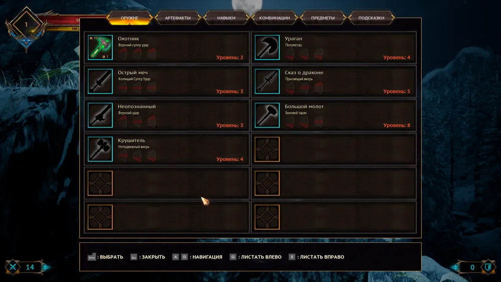 Обычное оружие можно подобрать с тел врагов, уникальные образцы или артефакты (коих всего шесть), отыщет только внимательный исследователь в секретных локациях. Лишь артефактное вооружение обладает супер-ударом, на который расходуется шкала супер-атаки. Данная шкала, так же, как и опыт, повышается после убийства врагов.