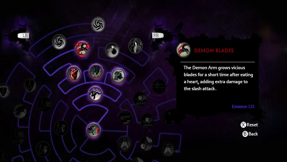 Джеки также может усилить стандартные атаки, например демонические руки, добавляя бонусные эффекты, такие как разорвать людей братства или захват. Демоническое Лезвие один из таких способностей, как показано выше, дает временное усиление повреждения для разрывания или для поедания сердца врагов (чтобы восстановить утраченное здоровье).