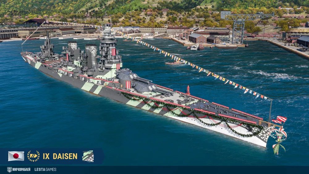 Обновление 12.3 приносит с собой возвращение верфи Куре, и на ее стапелях начнется строительство линкора IX уровня Daisen. Строительство корабля состоит из 34 этапов, 29 из которых можно получить, выполняя группы боевых задач. Корабль вооружен восемью 410мм орудиями ГК в четырех башнях. Орудия отличаются хорошей точностью и невысоким для линкоров временем перезарядки. Также Daisen оснащен четырьмя четырехтрубными торпедными аппаратами с высокой дальностью хода и уроном торпед.