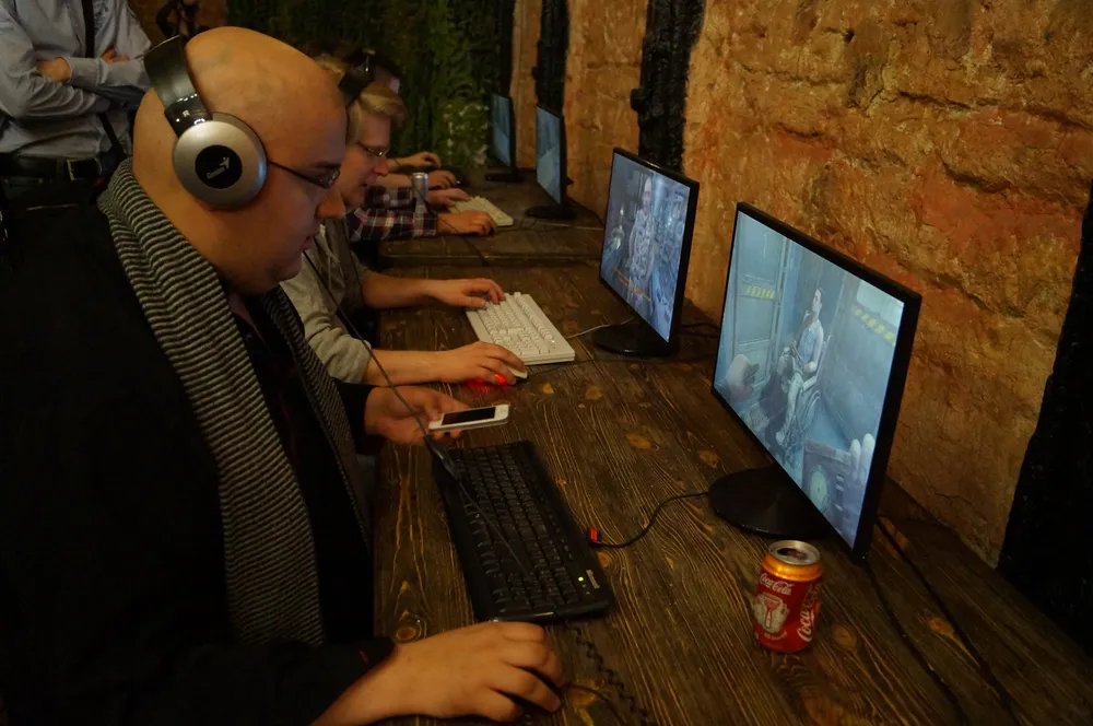 “Лабиринт” – это клуб, но не тот, где трясут попами под музыку, а где бегают в камуфляже, бряцают оружием и проводят соревнования по страйкобу и лазертагу. Очень интересное заведение, особенно если учитывать, что располагается оно в подвальных помещениях пивзавода. Стены выложены из старого красного кирпича с разводами и плесенью, напольная плитка явно застала революционные времена, с потолка торчат огрызки проржавевших труб, мрачные и узкие коридоры опутаны паутиной, в воздухе витает запах древности. Шикарное местечко в духе “Метро”. Жаль только, что исследовать его мне в полной мере не удалось - под мероприятие были отведены лишь две комнаты. Большие, правда, и со сводами высокими, что нетипично для подвала. В первом зале почтенные гости обсуждали меж собой дела насущные и наслаждались постапокалиптическим фуршетом (картошка, хлеб, сало, грибная настойка), во втором - играли в “Метро 2033: Луч надежды”, брали интервью у разработчиков из 4A Games и непосредственно у Дмитрия Глуховского. Честно, я очень хотел пообщаться с Дмитрием Алексеевичем, но слишком поздно озаботился этим вопросом – свободные слоты на интервью разлетелись как воробьи под градом еще за неделю до презентации.