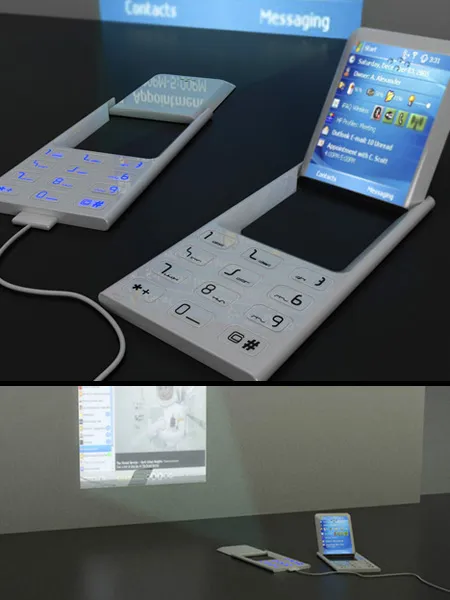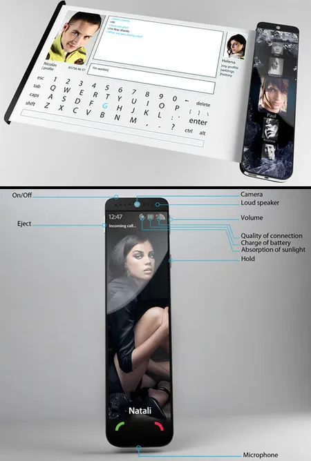 2. Телефон-свиток. Российский дизайнер Александр Мукомелов представил телефон с гибким сенсорным экраном, который расположен внутри тонкого корпуса и раскрывается как свиток. Решение основано на использовании двухслойного сенсорного OLED-экрана, покрытого наноматериалом, который твердеет при подаче на него низкого напряжения. С помощью такого экрана можно с комфортом просматривать фильмы или работать в Интернете. Заряжать телефон не нужно – он работает на солнечной энергии, аккумулируемой специальным покрытием корпуса.