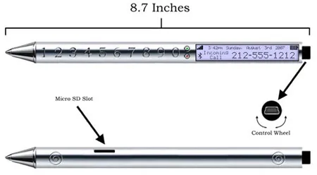 5. Ручка-телефон. На первый взгляд кажется, что в жертву столь нестандартному форм-фактору принесены едва ли не все привычные нам функции, но при детальном рассмотрении выясняется, что это не так. Здесь присутствует цифровой ряд клавиатуры, небольшой LED-дисплей для отображения информации и навигации по меню, разъём mini-USB для синхронизации и зарядки аккумуляторов и даже слот для флеш-карт формата microSD. В общем, обычный набор бюджетного телефона – но устройство ведь всё-таки размером с ручку! Это впечатляет.
