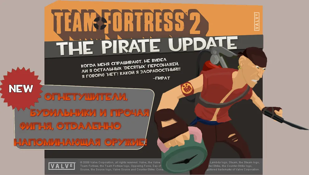 Последний предмет экипировки нашего воина - огнетушительГроза семи огней. Тут все просто - это универсальная защита от любого класса. При нажатии на правую кнопку мыши (я забыл сказать, что у пирата есть карманный хомяк с тремя кнопками) , пират устремляется ввысь, благодаря сильной струе из огнетушителя. Это не только позволяет нашему голубому солдафону совершить эффектный прыжок над врагом, но и тушит персонажа и окружающих союзников. К сожалению, заряд быстро кончается, и долго плевать на макушки врагов не получится.