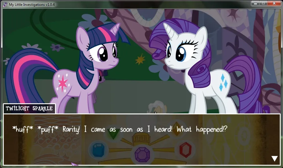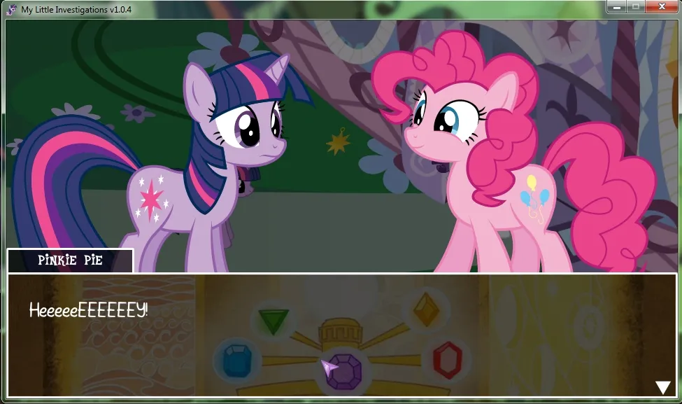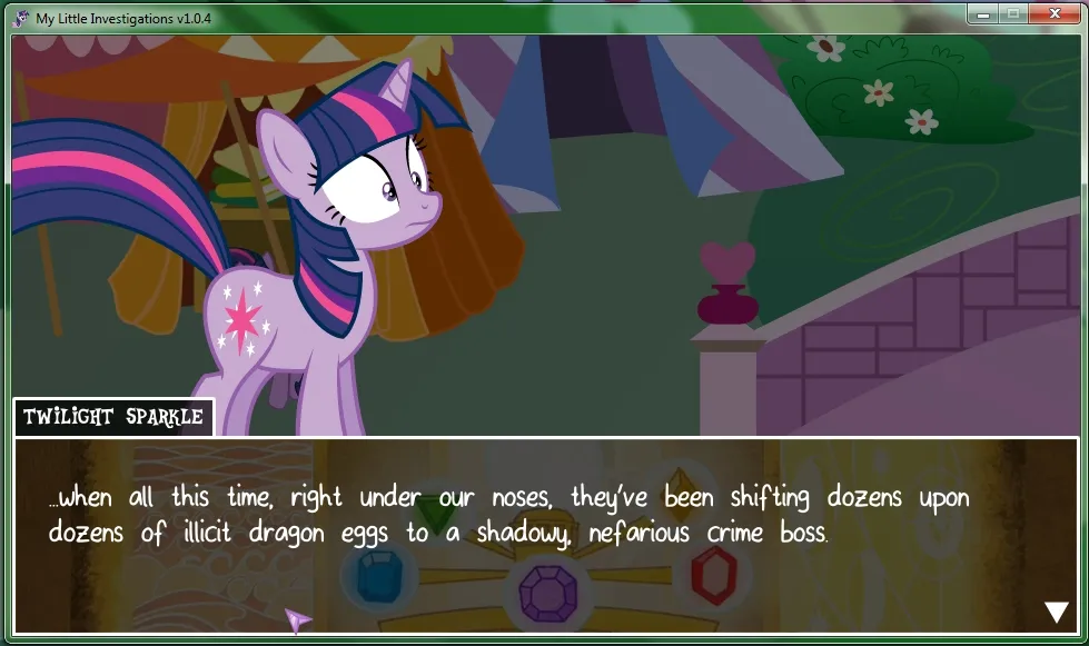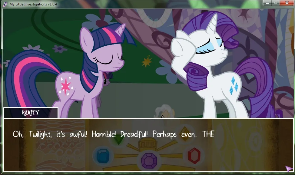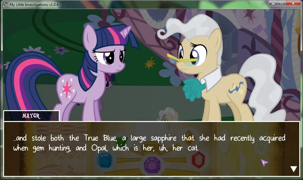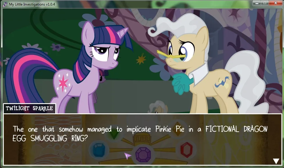 Самая большая проблема геймплея это то, что невозможно убыстрить медленную прокрутку текста, и если вы не играли в такие игры раньше, то можете увязнуть. Хотя общая трудность задач низка, в игре не сразу начинаются допросы, с начала игры есть некоторые ограничения. Иногда, кажется, что в данном сценарии должно быть более одного варианта для доказательства. Или, что Сумеречная искорка делает порой некоторые довольно впечатляющие скачки в логике для того, чтобы найти нужные ей улики, но, я думаю, именно поэтому я студент Селестии номер два.