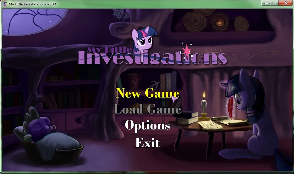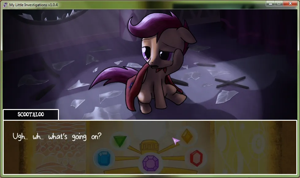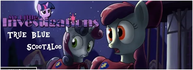 В первой готовой части, My Little Investigations: True Blue Scootaloo, вы играете за единорожика Твайлайт Спаркл (Сумеречную Искорку), которая решает взять дело в свои копыта, когда небольшой пегас обвиняется в совершении преступления.