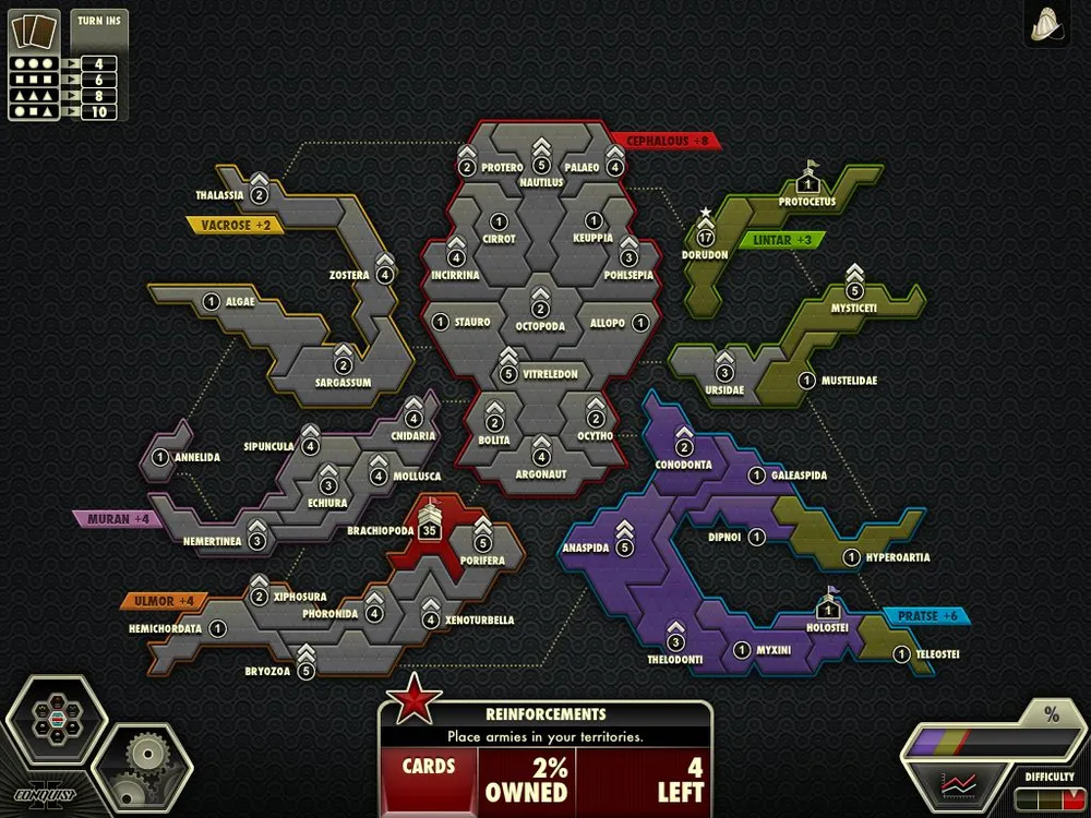Победить в Conquist 2 можно разными способами. Например, захватывать пачками земли, расширяя свои владения, оставляя противников ни с чем. Или, например, заполучить мировое господство самым простым путем: набрав больше очков на игральных костях. Есть один важный элемент в игре — армия. Чем ее больше (а она измеряется в штуках), тем больше шанс заполучить экзотические государства и территории вроде Таиланда или Южной Америки. Количество ходов напрямую зависит от количества дружины. Чтобы получить больше армий, после каждого хода при условии, что была захвачена как минимум одна земля, дается карта с определенной геометрической фигурой: квадрат, круг, треугольник. Потрудившись собрать одну из предложенных в игре комбинаций, например, 3 квадрата, можно получить +6 армий в собственное пользование. Все это звучит несколько диковато на словах, но затягивает неимоверно.