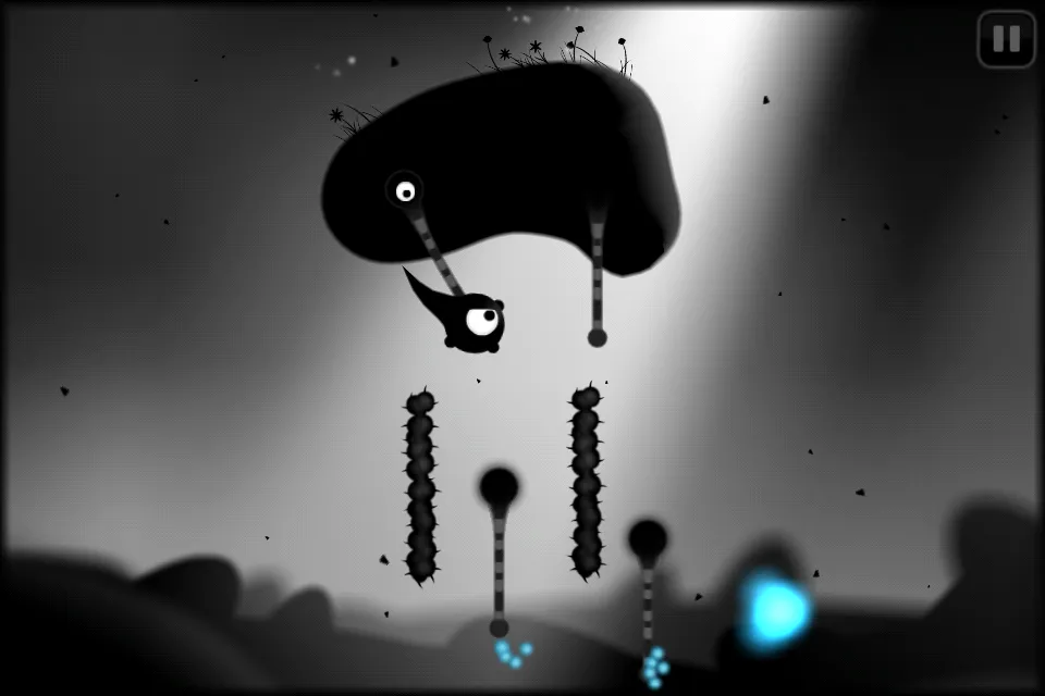 Стоит избегать злых тянучек, торчащих из земли. Когда она поглощает нашего героя, то выплевывает только его глаз. Зрелище не из приятных, особенно тогда, когда ты в процессе игры сильно привязываешься к кляксе. Остерегайтесь колючек, похожих на подвешенные гусеницы. Они мигом сдуют нашего пузырика.