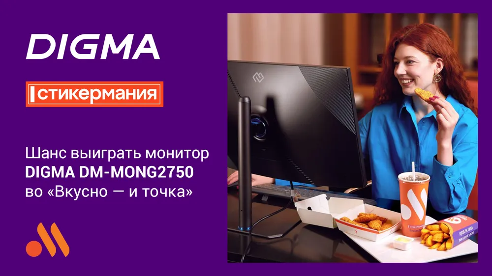 Бренд DIGMA, международный производитель цифровой техники и электроники для дома и работы, стал партнером «Вкусно — и точка», ведущей сети предприятий быстрого обслуживания в России. DIGMA предоставит игровые мониторы в качестве призов для участников «Стикермании», которую сеть «Вкусно — и точка» проводит в более чем 850 предприятиях по всей стране.