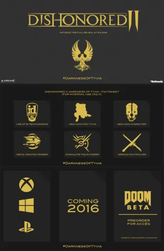 Появились первые детали о продолжении игры Dishonored, которое получило название Dishonored 2: Darkness of Tyvia. Выход игры запланирован на 2016 год. Вас будет ждать совершенно иной главный герой, который будет использовать как уже известные по первой части способности, так и абсолютно новые.