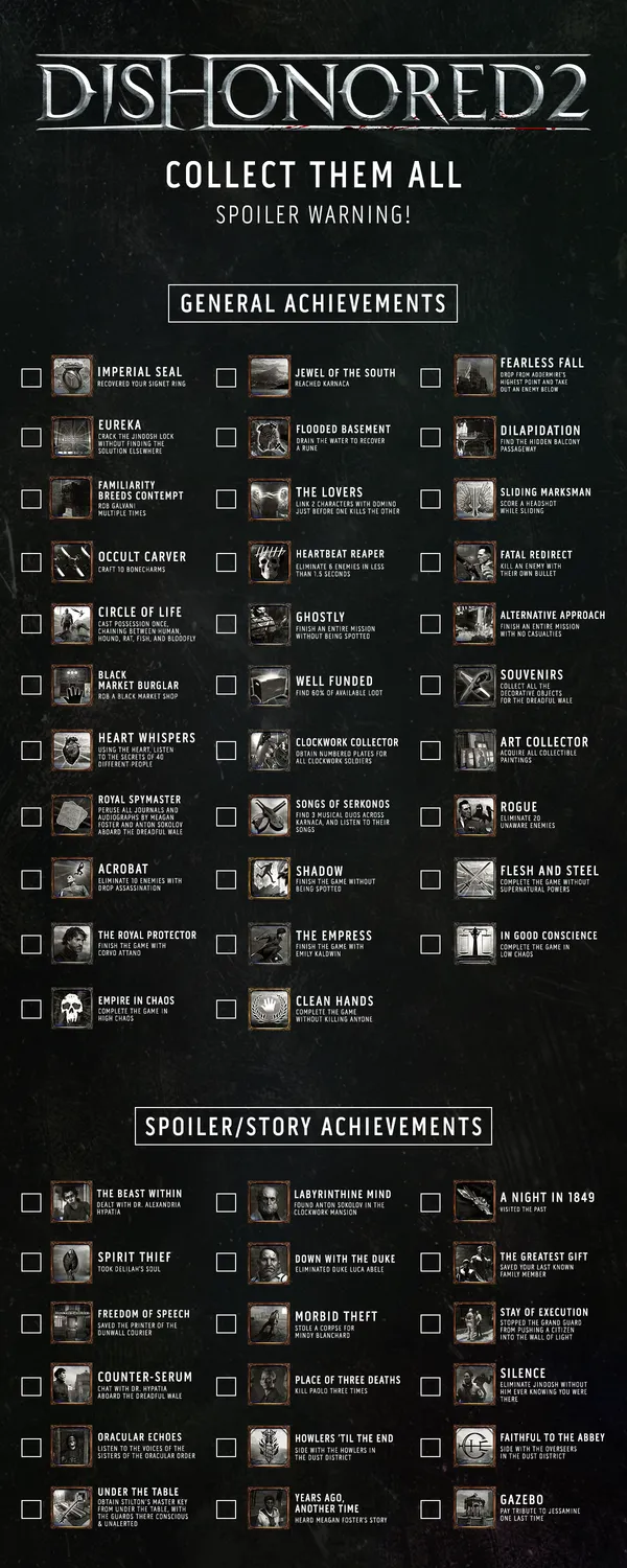Ну, а для любителей получать достижения будет полезен их полный список (нажмите картинку для увеличения). В представленном списке есть и сюжетные достижения, так что если хотите оставить место сюрпризам, не смотрите.