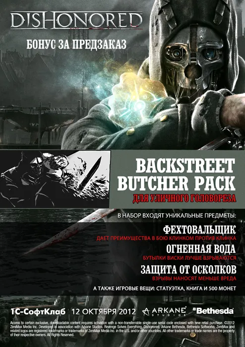 1С-Интерес http://www.1c-interes.ru/news/14595713/ - 899 рублей. Версия с ограничениями на активацию и запуск, другой AppID, DLC «Backstreet Butcher Pack» (бонус предзаказа, эксклюзив 1С-Интерес!), куда входят Фехтовальщик (дает преимущества в бою клинком против клинка), Огненная вода (бутылки виски лучше взрываются), Защита от осколков (взрывы наносят меньше вреда), Статуэтка, Книга и 500 монет.