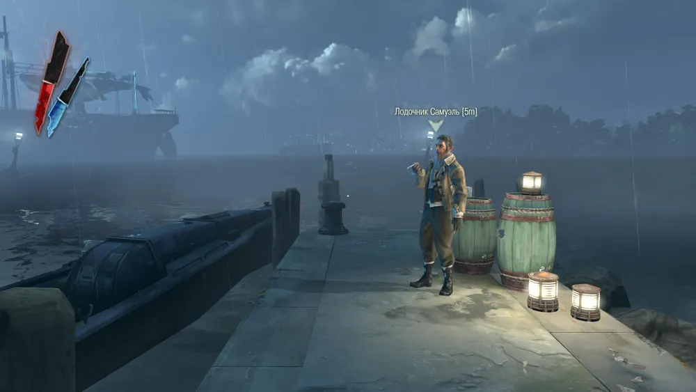 Лодка с Самуэлем и Корво прибывает в гавань винного квартала (примерно то место, где заканчивается миссия «Верховный смотритель»).