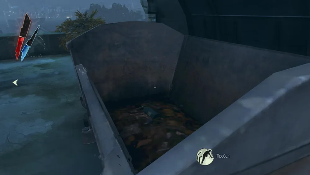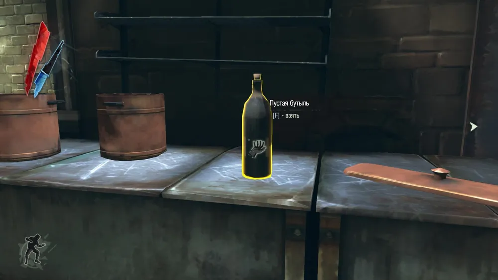 Корво решается на отчаянный шаг — проникнуть в здание и забрать бутылку. К сожалению, перевернутый треугольник указывал на пустую бутыль… Корво в замешательстве.