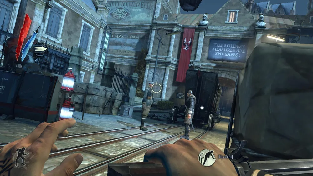 Корво поднялся по лестнице и увидел двух стражников. Они стерегли парадный вход в бараки. Наш герой обращается к Сердцу: