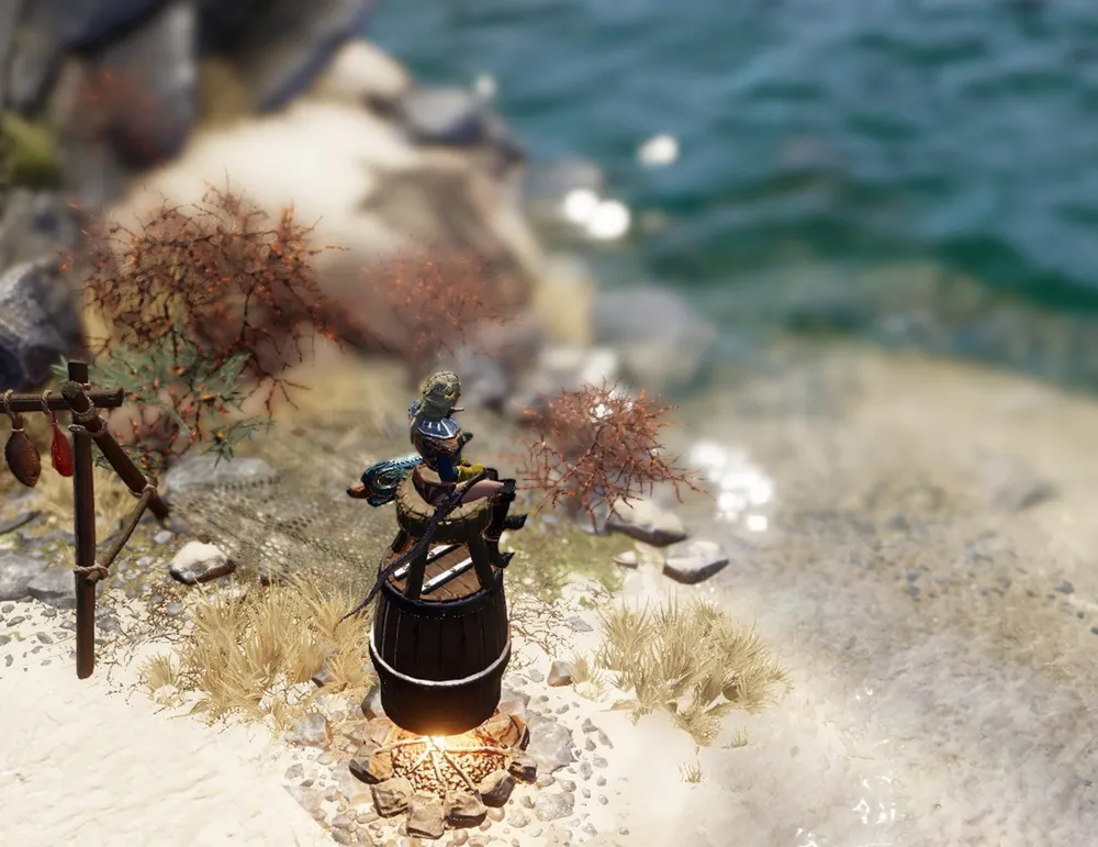 Зато выяснилось, что огонь, как и в первой части, весьма необычен: твёрдый он. Спокойно ставим сверху, что захотим (кроме котла и сковородки!); ещё и отдохнуть можно, морем полюбоваться. Красота!