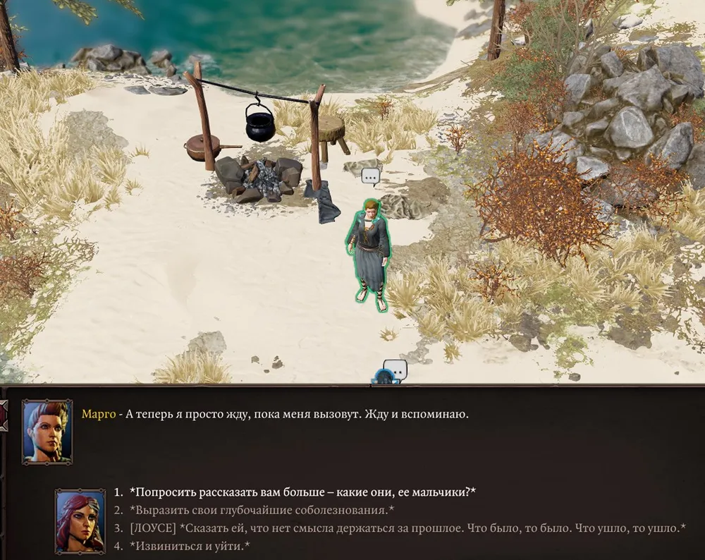 Спешим вдоль берега к эльфу Маолу; Сандор сообщает ему о потере и получает рубин (увы, Сильвии рубина не досталось!). Каждый из четырёх соратников просит Марго рассказать о её мальчиках – и каждый получает свиток с заклинанием «Восстановление».